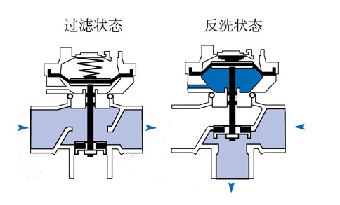反冲洗阀应用于至少有两个并列过滤单元的自动反冲洗过滤系统,即:在反冲洗过程中,经一个过滤单元过滤后的洁净水作为另外一个过滤单元的冲洗水。